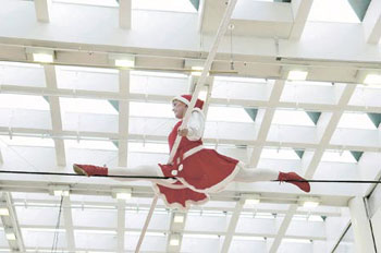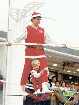 據(jù)香港明報報道,一行8人的衛(wèi)氏家族成員,昨(6日)于香港大埔商場作高空表演。在半小時表演內(nèi),衛(wèi)氏家族成員粉墨登場,一家大小扮成圣誕老人。帶領(lǐng)家族成員的Peter Mario,先以一個“筋斗”給觀眾一個見面禮,再來一招“倒豎”,這些動作看似簡單,但卻是在高空13米、離地近兩層樓高的鋼在線進行。