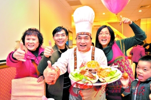 “各位貴賓,大家好,非常榮幸能在中華民族最重視的傳統(tǒng)佳節(jié)里,為大家準(zhǔn)備臺(tái)灣地區(qū)傳統(tǒng)的‘圍爐’,現(xiàn)在我開(kāi)始為大家上菜,這道菜里有鮑魚(yú),還有醉蝦……”昨晚6時(shí)剛過(guò),臺(tái)北“頂廚國(guó)宴”餐廳的廚藝總監(jiān)黃德忠身著喜慶的廚師服,親自為廣之旅的四桌游客端上了年夜菜肴。