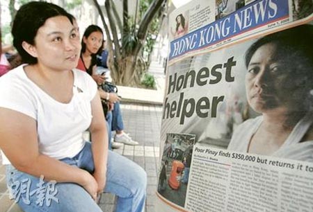 據(jù)香港《明報(bào)》報(bào)道,離鄉(xiāng)別井為兩餐,從菲律賓來港謀生的女傭Mildred Perez,不甘雇主對她做出的不法行為,訴諸法院,在候?qū)徠陂g不能另找工作,只靠拾荒維生,每天掙約38元生活費(fèi)。有一天,她意外地得到一個(gè)可擺脫貧困的機(jī)會(huì)——在垃圾堆中拾獲35萬元巨款,但她把錢全數(shù)退還失主,雖然換來的只是一盒曲奇餅作答謝,但她并無后悔,繼續(xù)其撿破爛的日子。