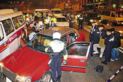 中新網(wǎng)1月25日電 香港一名司機(jī)涉嫌以偷來的士做無本生意多時(shí),24日晚在銅鑼灣因沖紅燈惹起交警注意后逃走,結(jié)果掀起一幕由港島追到九龍全長22公里的警匪飛車追逐戰(zhàn),賊的士后于東隧九龍出口收費(fèi)廣場(chǎng)撞毀一部電單車及一部警車后始停下,亡命司機(jī)當(dāng)場(chǎng)束手就擒,但共有7名警民受傷送院,包括的士司機(jī)。