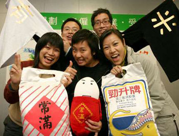 維園擺檔“勁有米”由一班年輕人合資,貨品以“米”為主題,包括以家家必備的米袋為造型的坐墊。攤位代表說:“參考過往的年宵,大熱的都是以食品為主題改造的產(chǎn)品。今年是鼠年,‘老鼠愛大米’成為了我們的構(gòu)思,有米有米,香港人成日都用‘有米’來形容有錢,意頭好一定受歡迎!