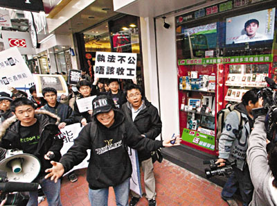 網(wǎng)民沿途高叫口號及展示標(biāo)語,游行人士途經(jīng)一間店鋪時(shí),店外電視正在播出早前陳冠希的道歉錄像,隨即惹來網(wǎng)民起哄,大呼“選擇性執(zhí)法可恥”等口號。