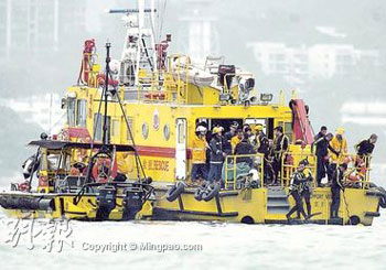 撞船意外后,香港多個部門連續(xù)兩晚通宵搜救,10艘水警輪、6艘海事處船舶、5艘消防船和5架飛行服務(wù)隊直升機(jī)先后參與救援,但一直未有失蹤者音信。消防處表示,23日每次派出一組兩人的蛙人,9度潛入海底搜索,且曾經(jīng)接近船身,以直接敲打方式測試有否生命跡象,可惜絲毫沒有反應(yīng),蛙人也未能進(jìn)入船艙。