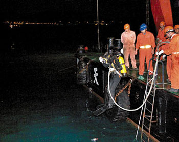 廣州打撈局的潛水員彭文科25日傍晚6時30分,緊接同事潛入海中探摸,10多分鐘后,對講機(jī)傳來看到“REST KICTEB AREA”的字母,沉船船長即表示彭文科已經(jīng)進(jìn)入到甲板休息室。彭文科聽從指示,用攜帶的導(dǎo)引繩系在門扣上,然后浮上水面。