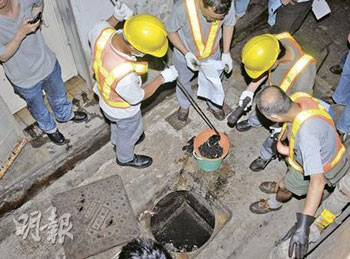 但街坊稱,兇案現(xiàn)場樓下的地產(chǎn)鋪和牛仔褲鋪的污水渠,近日傳出如“死老鼠“般惡臭。渠務(wù)署職員8日與探員到石硤尾現(xiàn)場一帶的沙井搜查,探員倒入化學(xué)顯影劑后利用弧光燈搜索,撈起兩團懷疑碎肉,又收集了4盆淤泥,全部帶返警署調(diào)查。