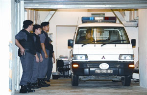 圖:囚車準(zhǔn)備駛離初院,獄警在場戒備。(圖片來源:澳門日?qǐng)?bào))