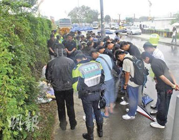 蘇志豪的親友11日到殮房認(rèn)尸后,與其同事分乘兩架旅游大巴,一行逾百人到出事現(xiàn)場(chǎng)致祭。部分女親友表現(xiàn)激動(dòng),不斷流淚,要由旁人攙扶安慰,場(chǎng)面哀傷。
