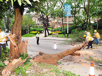 中新網(wǎng)9月3日電 據(jù)香港文匯報(bào)報(bào)道,香港赤柱繼上周三發(fā)生百年古樹砸死19歲香港大學(xué)女生莊頌賢后,附近赤柱村道2日也出現(xiàn)另一棵呈V形生長(zhǎng)逾60年樹齡老樹,也因被侵蝕過(guò)度有半邊大樹倒下,幸好沒(méi)有造成傷亡。