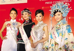28日國際小姐候選會(huì)見傳媒,各佳麗以自身的國家地區(qū)特色服飾現(xiàn)身,奢華、高貴、性感,各具特色,各有韻味。63位麗人站臺(tái)時(shí),會(huì)場儼如一場服飾嘉年華,也體現(xiàn)國際小姐的國際性。呂蓉茵則決定收起美好身段,以一襲金襯藍(lán)的粵劇戲服出場,同樣謀殺現(xiàn)場相機(jī)的內(nèi)存。
