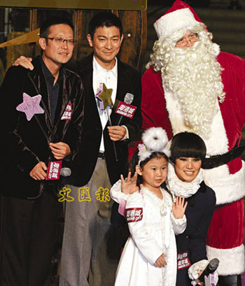 金融海嘯影響香港市道,但圣誕燈飾亮起添了幾分燦爛繽紛,華仔也在一顆星星飾物之上寫上“幸!倍郑T赶愀廴擞肋h(yuǎn)都活得幸福。何韻詩(shī)都希望香港人能多“關(guān)注”和“包容”,劉偉強(qiáng)也祝愿“世界和平”。至于沒有出席的女主角舒淇,她也一早拍了片段,向市民講圣誕快樂。