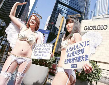 中新網(wǎng)11月26日電 據(jù)香港《明報(bào)》報(bào)道,慣以性感女郎進(jìn)行抗議活動(dòng)的“善待動(dòng)物組織”,25日派出兩名僅穿內(nèi)衣的“動(dòng)物守護(hù)天使”,到香港中環(huán)置地廣場(chǎng)一間時(shí)裝名店外抗議。