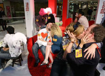 在鎂光燈的閃爍下,五對來自不同國家的情侶,坐上獨(dú)特的“愛情連椅”,他們要在眾目睽睽下,用各異的方式吻自己的愛侶,持續(xù)2分14秒。圍觀市民大感興趣,摒住呼吸觀賞現(xiàn)場的熱吻。