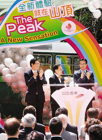 為配合該項(xiàng)計(jì)劃,有關(guān)單位更為山頂注入了兩項(xiàng)新元素,分別是由古董纜車車廂改裝而成的香港旅游發(fā)展局山頂旅客咨詢中心及香港杜莎夫人蠟像館的香港特區(qū)行政長官曾蔭權(quán)蠟像,兩者均于7日揭幕。