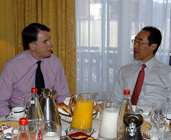 唐英年與歐盟貿(mào)易專(zhuān)員曼德?tīng)柹矔x早餐時(shí)強(qiáng)調(diào),香港繼續(xù)努力推動(dòng)多邊貿(mào)易自由化,并期望香港與歐盟不斷加強(qiáng)雙邊經(jīng)濟(jì)聯(lián)系。他與比利時(shí)官員會(huì)面時(shí),介紹了香港的最新發(fā)展,雙方均期望兩地貿(mào)易、投資、文化和教育有更多的交流和合作。