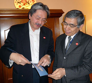 香港財(cái)政司司長(zhǎng)曾俊華(左)在墨爾本,與亞洲開發(fā)銀行總裁Haruhiko Kuroda進(jìn)行雙邊會(huì)議,并致送紀(jì)念品。(圖片來源:香港特區(qū)政府網(wǎng)站)
