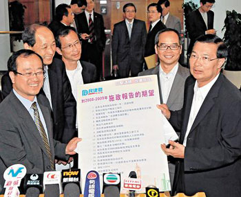 民建聯(lián)多位現(xiàn)任和候任立法會(huì)議員10日應(yīng)曾蔭權(quán)邀請發(fā)表《施政報(bào)告》意見。譚耀宗說,特別向曾蔭權(quán)提出,在適當(dāng)時(shí)間安排新一屆立法會(huì)議員到訪內(nèi)地,例如到上海參觀世界博覽會(huì),但沒有提及特定的時(shí)間表。