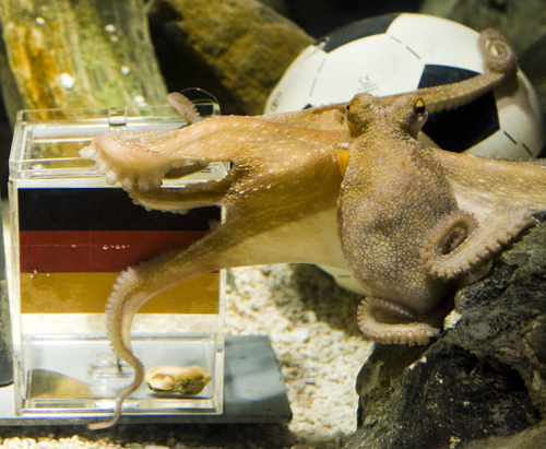 章魚馬拉多納今年1歲,住在伊斯坦布爾的一個(gè)水族箱里。西班牙隊(duì)和荷蘭隊(duì)的國旗被分別插在水族箱的兩端,馬拉多納游向西班牙國旗,并且用觸手將旗幟緊緊抱住。馬拉多納的主人非常高興,因?yàn)樗俏靼嘌廊恕?