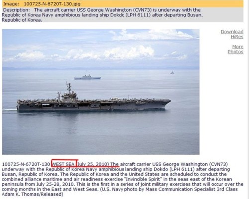 記者于7月28日再次登錄美國海軍官方網(wǎng)站,發(fā)現(xiàn)之前被標(biāo)為拍攝于“西!(中國稱“黃!)并在7月27日被刪除的照片,已經(jīng)再度被上傳到網(wǎng)站上,而其標(biāo)注的地點已經(jīng)被更正為“日本海”。
