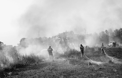 波塔波夫的話很快得到了驗證。就在記者返回途中,距莫斯科大約15公里處,路邊一個加油站附近起火。這個加油站南側有一道大約10米寬的隔離帶,再往外則是一個比足球場還大的草場,草場的東、西、南三面是森林。記者看到,100多米長的火龍借著風力向加油站方向翻滾而來。過火之處,留下黑乎乎的灰燼。加油站的職工用提水桶和臉盆盛著水往草場飛奔。