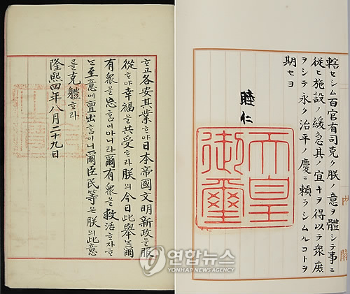 韓日合并當(dāng)時(shí)第三任朝鮮統(tǒng)監(jiān)寺內(nèi)正毅于1910年8月22日全權(quán)委任大韓帝國(guó)總理大臣李完用勸說純宗皇帝在條約上簽名,純宗皇帝被逼無奈,印上國(guó)璽(大韓國(guó)璽),并在上方署名。但條約若要生效,須公布兩國(guó)皇帝的詔書。純宗在條約上署名后,寺內(nèi)正毅與李完用簽署有關(guān)雙方各自準(zhǔn)備詔書的協(xié)議。再之后的8月29日,韓日兩國(guó)頒布了詔書。