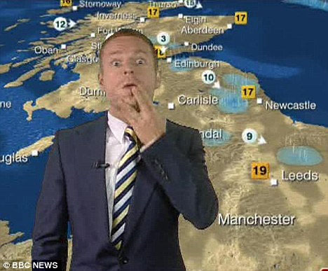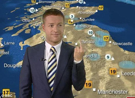 英國(guó)廣播公司天氣節(jié)目主播日前在節(jié)目中做出令人大跌眼鏡的舉動(dòng),他當(dāng)眾朝新聞主播豎中指引發(fā)熱議。