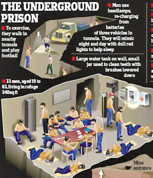為了養(yǎng)活妻子和兩個年幼的孩子,巴斯托斯不得不前往智利北部尋找工作,幾經(jīng)周折,2個月后他終于在地處北部阿塔卡馬沙漠的圣何塞銅礦找了份礦工的工作。然而讓人做夢也沒想到的是,剛剛逃離地獄的巴斯托斯,這一回竟然又跳入了“火坑”。8月5日,位于科比亞波市附近的圣何塞銅礦發(fā)生嚴(yán)重塌方,巴斯托斯與其他32名礦工被困井下700米處,直到17天后發(fā)被人發(fā)現(xiàn)時(shí),仍然奇跡般存活著。