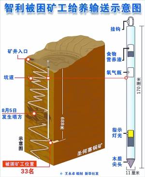 礦工烏爾阿回憶礦井坍塌時的恐怖場景:“太嚇人了,感覺就像整座山向我們壓來一樣。之后我們隱約看到了一個巨大的巖石,它將進(jìn)出通道給堵死了!33人躲在避難所內(nèi),每隔一天吃兩小勺金槍魚罐頭和半塊餅干,用幾滴牛奶將這些食物沖進(jìn)肚子里。除了食物,他們還找到了地下水,這保證他們能夠活下來。經(jīng)過17天的等待,當(dāng)救援人員第8次將探桿深入地下時,他們在上面綁上了小紙條,上面寫著“我們?nèi)?3人都活著”。