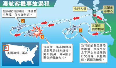 據(jù)報道,該架緊急降落的飛機(jī)為波音747-400客機(jī),航班編號QF74,機(jī)上載著212名乘客和18名機(jī)組人員。飛機(jī)在當(dāng)?shù)貢r間9月1日晚11時05分從舊金山起飛,但航行了15分鐘后,機(jī)上乘客忽然感到極不正常,來自飛機(jī)右邊的強烈震動,坐在右邊的乘客大吃一驚。飛機(jī)一下子猛烈左轉(zhuǎn),有乘客赫然看到窗外有火焰噴出。機(jī)師不久后宣布客機(jī)需要緊急降落。