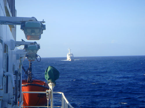 9月13日上午10時(shí)許,在距離釣魚島30海里左右的海面上,“中國漁政202”船和奉命趕來的“中國漁政201”船會合,兩船開始編隊(duì)在釣魚島附近海域巡航。也就從這一刻起,糾纏封堵的日本海上保安廳巡邏船達(dá)到了7艘,有跟在后頭的,有繞前干擾的,有時(shí)還幾艘一起圍著中國漁政船編隊(duì)高速轉(zhuǎn)圈,空中也照例有直升機(jī)在盤旋。日本艦船除了重復(fù)那些無理的喊話外,還向中國漁政船提出要求“如果轉(zhuǎn)彎,請?zhí)崆案嬷。孫士薦說,我們船的答復(fù)是“請你們保持安全距離”,在海上行船,船和船之間起碼都要相距兩三海里,而日本艦船干擾我們巡航時(shí)常常離中國漁政船不到1海里,這對于航行速度較快的大型船只而言是很危險(xiǎn)的。兩條中國漁政船在這片海面上還停泊漂流,緊張的日本巡邏船立時(shí)圍上來。7對2的對峙持續(xù)到中午時(shí)分。當(dāng)天傍晚6時(shí),2艘漁政船在釣魚島以南如約接到了“閩晉漁5179”,并最終完成護(hù)送任務(wù)。