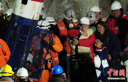 智利圣何塞銅礦8月5日發(fā)生礦難,33名礦工在井下約700米處被困超過2個月。經(jīng)過設計方案、挖掘隧道等一系列準備工作,最后階段的救援于當?shù)貢r間12日晚展開。智利總統(tǒng)以及多名智利官員到場迎接礦工出井。