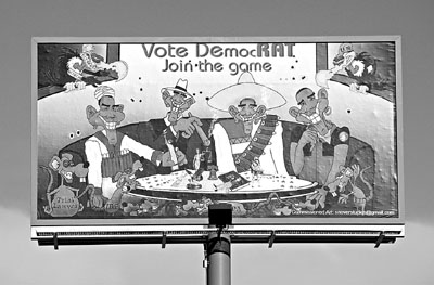 一幅位于美國科羅拉多州梅薩縣的大型選舉廣告牌惹來爭議。該廣告牌將奧巴馬描繪成伊斯蘭自殺式炸彈襲擊狂徒、同性戀者、抽雪茄的歹徒和墨西哥土匪,并畫上幾只身上寫上律師、美國國家稅務(wù)局(IRS)、國家環(huán)境保護(hù)署(EPA)和美聯(lián)儲的大老鼠,諷刺他們和奧巴馬蛇鼠一窩。