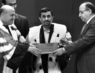 14日上午,內賈德在位于貝魯特的黎巴嫩大學受到了師生們的熱烈歡迎,并被授予政治學榮譽博士學位。黎教育部長和黎巴嫩大學校長為他披上博士服并頒發(fā)了學位證書。獲得博士學位的內賈德激動不已,當場向學生們發(fā)表講話。他說:“我們相信真正的科學會為人類、和平、愛和友誼服務!