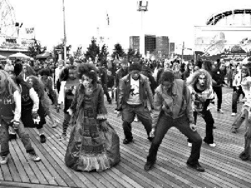 23日,在紐約布魯克林,人們模仿邁克爾·杰克遜專輯《戰(zhàn)栗》里的“僵尸舞”動(dòng)作,迎接即將到來(lái)的萬(wàn)圣節(jié)。這也是為紀(jì)念這位已故流行樂(lè)天王而在全球各地展開(kāi)的“讓世界戰(zhàn)栗”活動(dòng)的一部分。當(dāng)天,全球30多個(gè)國(guó)家的270多個(gè)城市的杰克遜歌迷也在同一時(shí)間跳起了“僵尸舞”。(宗和)