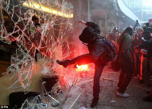 在游行隊(duì)伍經(jīng)過保守黨所在的一座高層大樓時,一些示威者打碎大樓玻璃,在大樓外將一幅招貼點(diǎn)燃。