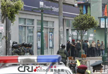 秘魯警方于當?shù)貢r間3日晚在首都利馬采取突擊行動,擊斃一名搶劫銀行的持槍歹徒,成功解救了被扣押在銀行內的33名人質。