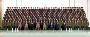 朝中社26日提供的照片顯示,朝鮮最高領(lǐng)導人金正日(前排右四)和勞動黨中央軍事委員會副委員長金正恩(前排左三)等日前與朝鮮功勛國家合唱團成員合影。新華社發(fā)