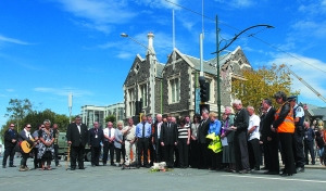 當(dāng)天12時51分,教堂鐘聲敲響,克賴斯特徹奇城內(nèi)警察、政府官員和居民靜默站立,一些人低下頭,一些人緊抱親友。正在廢墟中搜尋的救援人員也停止工作,低下頭,同全國民眾一起默哀。