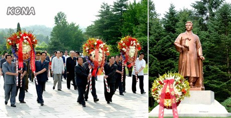 金正恩送來的花圈,擺放在金亨稷銅像和墳?zāi)骨啊3r勞動(dòng)黨中央委員會(huì)政治局常委金永南、崔永林、崔龍海,以及朝鮮各級領(lǐng)導(dǎo)干部、人民軍官兵、群眾和青年學(xué)生參加敬獻(xiàn)花圈儀式。