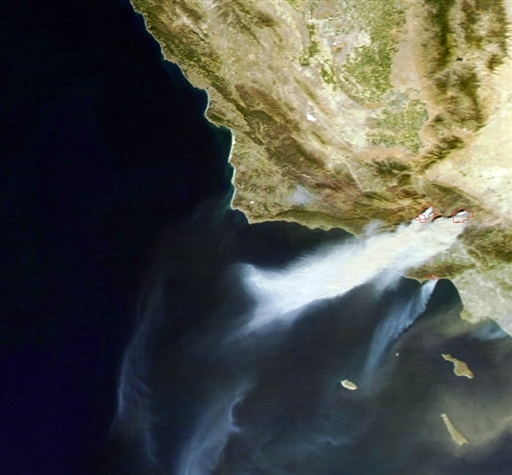 中新網(wǎng)10月23日電 美國加州近日多處發(fā)生山火,最少有9個火頭,圣迭戈縣有兩個,以北的海邊豪宅小鎮(zhèn)馬利布則有7個,加州州長施瓦辛格宣布7個縣進(jìn)入緊急狀態(tài);痤^逼近民居和一所大學(xué),最少3.6萬人須疏散,其中不乏好萊塢明星。山火共計燒毀了最少3萬英畝的土地和39幢房子,1500名消防員參與撲救工作。圣迭戈的火警造成1死,最少17人傷,包括4名消防員。衛(wèi)星拍攝到美國加州山火十分嚴(yán)重(見圖)。
