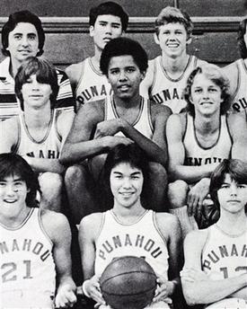 奧巴馬(第二排中間)在1977年高中時的照片。奧巴馬熱愛籃球,曾是學(xué);@球隊成員,大四時還隨隊獲州聯(lián)賽冠軍,作為一名前鋒擅長左手投籃?赡芤蛎諳bama發(fā)音的緣故,被隊友戲稱為轟炸機(O'Bomber)。