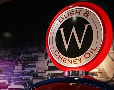 在巴士的末端還有一個(gè)汽油加油機(jī),上面寫著:“布什切尼石油公司”。