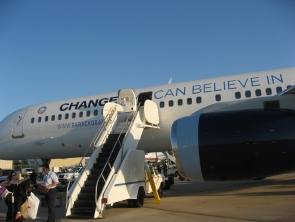 奧巴馬的競選專機(jī)是由一架波音757客機(jī)改裝而成的,整個機(jī)艙共分為三個部分,其中機(jī)頭部分是奧巴馬、他的家人以及高級助手們專用的豪華客艙,其后是專機(jī)機(jī)組人員專用休息艙,再后面則是商務(wù)客艙,接近機(jī)尾部分是專門為隨機(jī)采訪的媒體人士而設(shè)的經(jīng)濟(jì)客艙。奧巴馬選擇這架波音757客機(jī)作為專機(jī)后,對它進(jìn)行了較大幅度的改裝,他們將專機(jī)涂上了藍(lán)白色相間的顏色,機(jī)身兩邊寫著奧巴馬的其競選口號--“我們可以相信的改變”。其中引起強(qiáng)烈爭議的部分,則是奧巴馬將客機(jī)尾翼上的美國星條旗抹除掉,而噴上帶有太陽初升的奧巴馬獨特標(biāo)志。這架專機(jī)改裝完成后,立即載著奧巴馬競選陣營的工作人員和媒體人士飛行中東,奧巴馬21日更是乘坐這架競選專機(jī)飛抵伊拉克,并與伊拉克官員以及駐伊美軍高級將領(lǐng)會面。