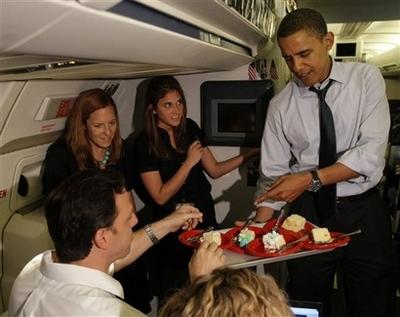 4日,奧巴馬在飛機(jī)上向隨行媒體人員派送生日蛋糕。