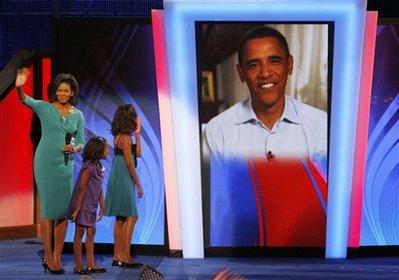 奧巴馬的兩個(gè)女兒莎夏和瑪麗亞在他們的母親演講完之后走上臺(tái),大廳內(nèi)揚(yáng)起Stevie Wonder唱的《瞧她們多可愛》的歌聲。