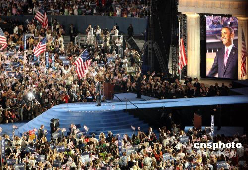 據(jù)“中央社”報(bào)道,奧巴馬是在極度興奮的七萬(wàn)五千名支持者面前接受民主黨總統(tǒng)提名,成為有史以來(lái)獲得主要政黨提名的第一位黑人總統(tǒng)候選人。他獲得提名的時(shí)間正逢馬丁路德金博士發(fā)表呼吁種族和諧的演說(shuō)《我有一個(gè)夢(mèng)想》的四十五周年。
