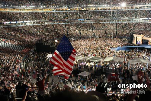 奧巴馬對(duì)在一連串愛(ài)國(guó)歌曲中揮舞著數(shù)千面小國(guó)旗,展現(xiàn)愛(ài)國(guó)情操的群眾說(shuō):“我要告訴你,約翰-麥凱恩先生,我們所有人都把國(guó)家擺在第一位!