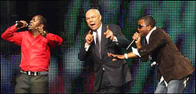 美國前國務(wù)卿科林·鮑威爾在一場以援助非洲為主題的演唱會(huì)上即興上演了一段嘻哈舞蹈,現(xiàn)場觀眾熱烈歡呼。