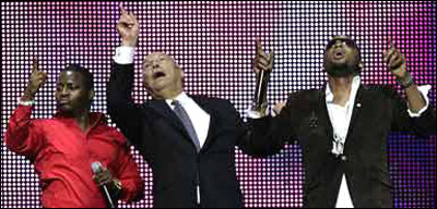 鮑威爾一身正裝登上舞臺,立刻引爆現(xiàn)場氣氛。鮑威爾看上去很有舞臺經(jīng)驗(yàn),熱情的與臺下觀眾進(jìn)行現(xiàn)場互動(dòng),帶領(lǐng)大家跳起了非洲最流行的Hiphop舞蹈Yahoozee。他還拿起話筒,拉開嗓門唱了幾句。
