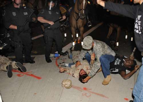 15日辯論會場外,警員與反戰(zhàn)示威者發(fā)生沖突。