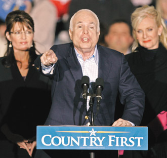 中新網(wǎng)10月24日電 美國總統(tǒng)選戰(zhàn)進入最后沖刺階段,共和黨策士難以決定候選人麥凱恩該打什么牌以力挽狂瀾之際,麥凱恩22日痛批布什的不是,企圖挽回選民的心。據(jù)臺灣《聯(lián)合報》報道,這是選戰(zhàn)開打以來,麥凱恩對布什最嚴厲最直接的批判,試圖與布什劃清界線的用意非常明顯。